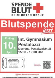 Meerane Regionale News 2. April 2026 DRK-Blutspendetermin im Internationalen Gymnasium Meerane 10.04.2026 15:00–19:00 Post Views: 116